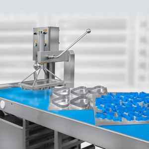 Beim Ausstanzen wird die Teigbahn durch ein Vakum von unten auf dem Band angesaugt und dadurch ein verkleben in den Formen sicher verhindert.