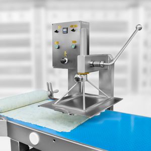 Die Teigrolle wird schrittweise abgerollt und die Teigbahn automatisch transportiert.
